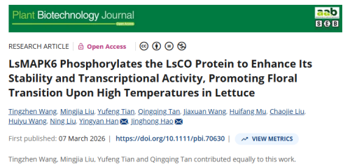 A team headed by Professor Han Yingyan and Professor Hao Jinghong from the College of Plant Science and Technology of BUA, recently published a research paper online in the internationally renowned Plant Biotechnology Journal, entitled LsMAPK6 Phosphorylates the LsCO Protein to Enhance Its Stability and Transcriptional Activity, Promoting Floral Transition Upon High Temperatures in Lettuce. The research reveals the core signaling module and molecular mechanism underlying high temperature-induced bolting of lettuce. It not only deepens the understanding of how plants integrate ambient temperature signals with developmental timing, but provides a key theoretical basis and potential target for the molecular design and breeding of lettuce varieties with enhanced heat tolerance and delayed bolting.